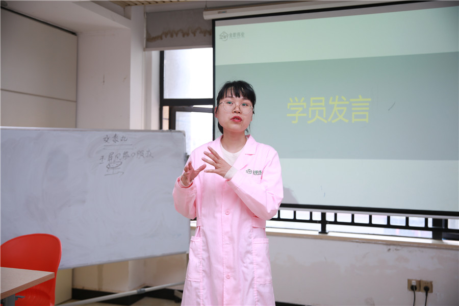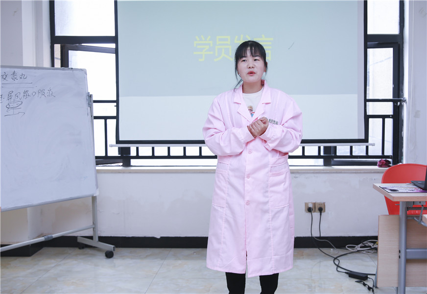 典礼伊始,资深小儿推拿讲师陈喜南为学员送上结业祝福。首先,她对每位学员顺利结业表示热烈地祝贺,“本期课程含金量很高,所以相对来说课程内容比较难,但每位学员都十分认真地学习,并顺利结业,值得点赞。”同时,她希望,离校后,学员们也能在家多看书、多练习,相互之间多交流,共同分享经验,如果有不懂的问题,可以随时问金职伟业的老师。