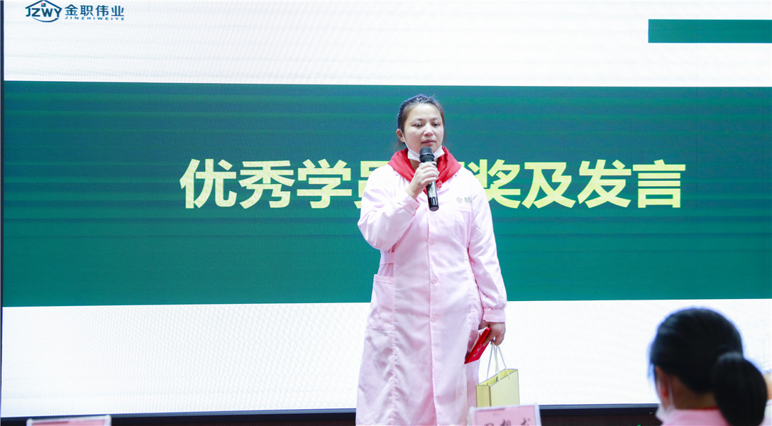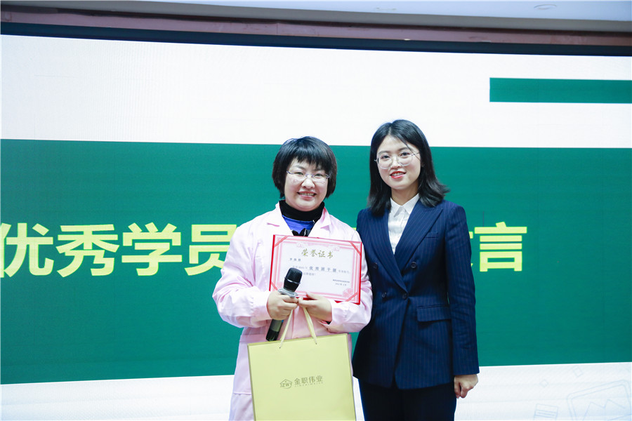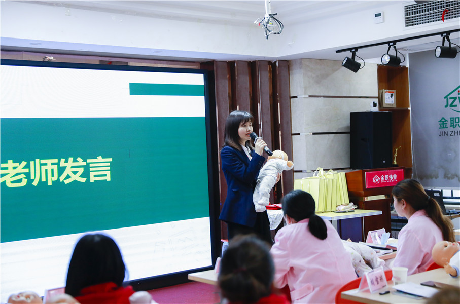 教务班主任王超群则向学员们分享了自己的学习经历,借此鼓舞学员,她也希望学员们,在未来,能够将在金职伟业学习的专业母婴知识与技能学以致用,帮助更多的宝宝健康成长。