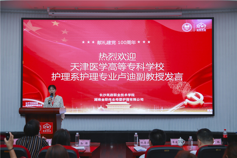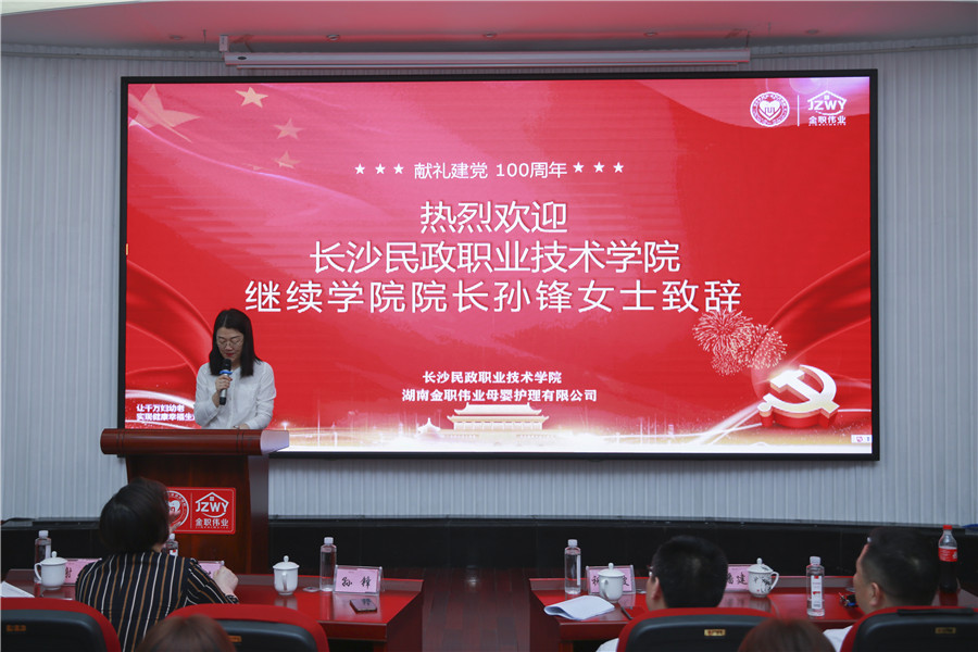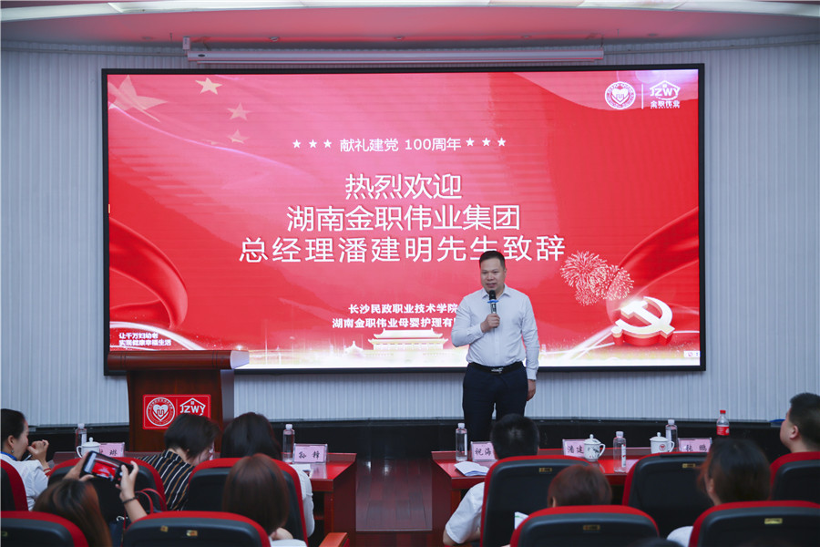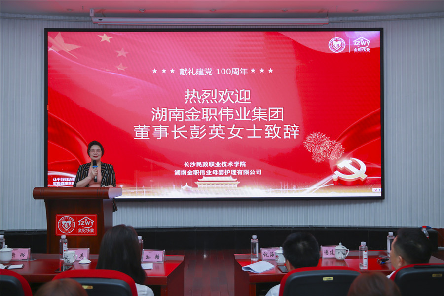 湖南金职伟业集团董事长彭英发表讲话。彭英强调,金职伟业作为教育部1+X第三批幼儿照护职业技能等级证书职业教育培训评价组织,将着力做好以下三点:一是,继续发挥好行业龙头企业的示范引领作用,带动更多托育、儿童保健、学前等领域企业规范发展、规模发展、质量发展;二是,不遗余力地推动1+X幼儿照护职业技能等级证书制度落地,推动幼儿照护职业技能等级证书成为行业用人准入的重要依据;三是,号召有条件、有需求的企业多拿出一些资源对学生群体加强就业、创业扶持,帮助他们更好地发展。