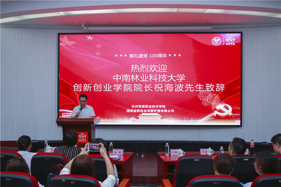 长沙民政职业技术学院继续教育学院院长孙锋,中南林业科技大学创新创业学院院长祝海波,湖南金职伟业集团董事长彭英、总经理潘建明,湖南外国语职业学院创新创业学院创新主任张鹏等出席并发言。