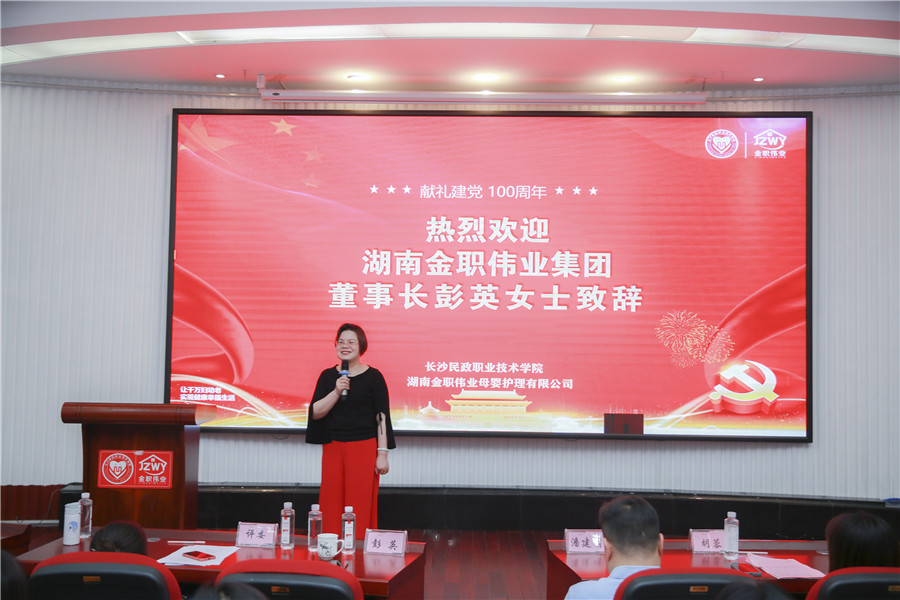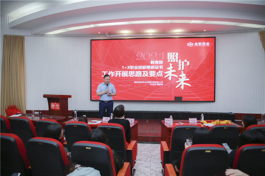 典礼上,湖南金职伟业集团董事长彭英率先进行致辞。首先,她热烈祝贺各位学员圆满完成本次师资及考评员培训,“感谢党和国家的大好政策,让金职伟业有如此好的发展平台,也感谢长沙民政职业技术学院和授课专家的倾心付出和鼎力支持,以及在座每位老师能积极参与到幼儿照护的事业当中来。”彭英表示,今后,金职伟业将借助1+X平台,不留余力地完善、创新幼儿照护领域的标准、课程、服务、教材体系,并积极落地1+X幼儿照护课程实训基地的建设,协助各大院校逐步推进1+X证书制度试点工作。