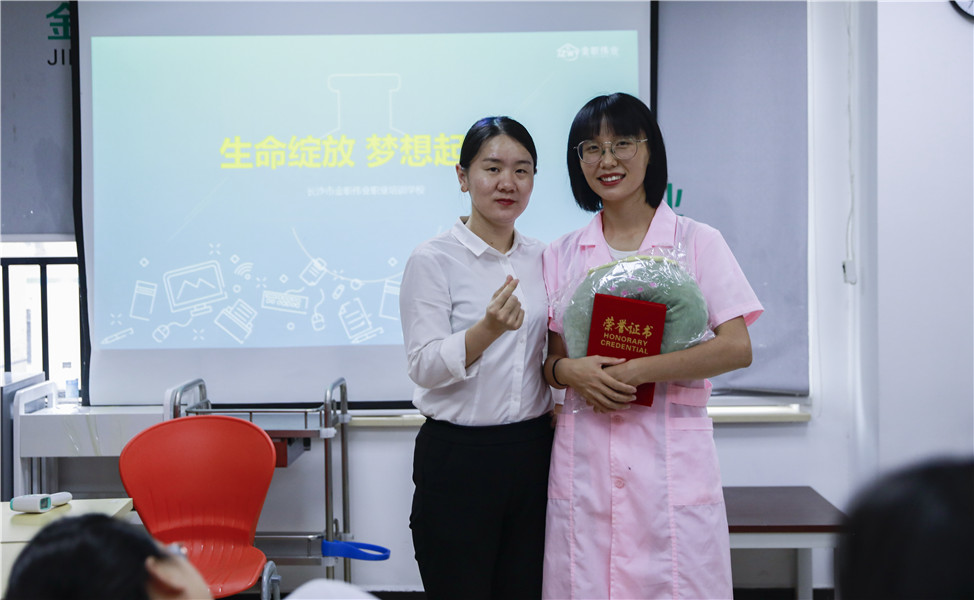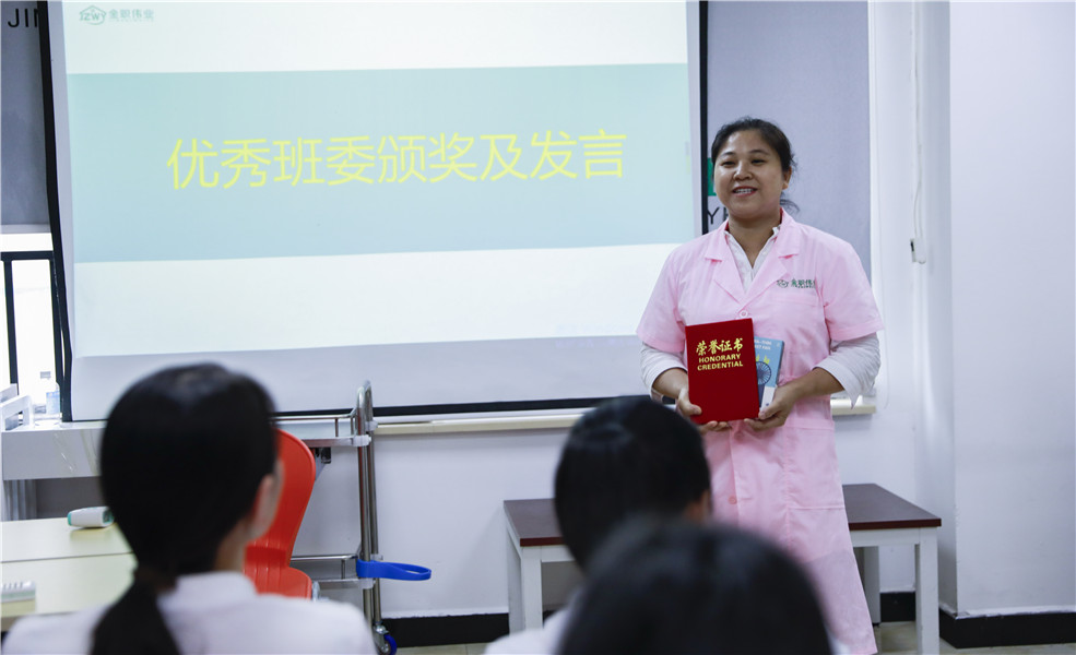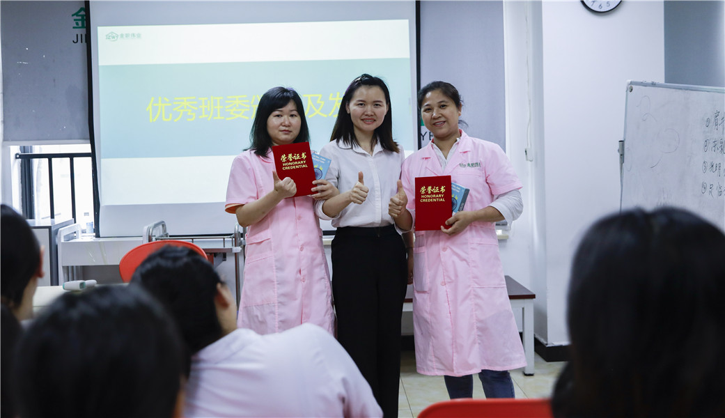 紧接着,老师们为认真负责的班干部及表现优异的学员颁发荣誉证书,陈妙荣获“优秀班干部”称号;曹静、陈美丽荣获“优秀学员”称号。
