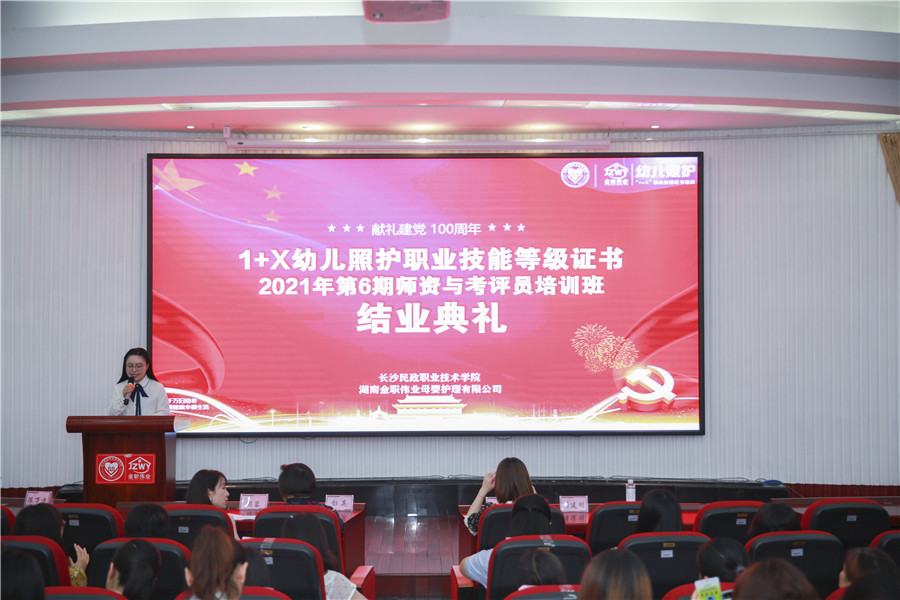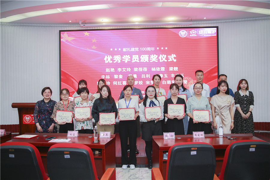 成都市温江区燎原职业技术学校杨依霖老师,在党史分享环节讲述了抗日英雄杨靖宇的故事,她强调,在这条滚烫的党史洪流中,相信英雄共产党的光,国家才会有未来,民族才会有希望。“从金职伟业的发展历程中,我深深感到,金职人甘愿做职业教育改革的先行者。金职精神,激励职教人不忘初心,奋发图强。”“在回校之后,一定会将学到的幼儿照护专业知识及技能,传授给更多人。未来,我也将始终致力于为1+X证书制度试点工作贡献自己的力量。”成都市温江区燎原职业技术学校谢小军老师、咸宁职业技术学院丰津玉老师,作为优秀学员代表进行发言。与此同时,还评选了一批优秀班干部、优秀学员。