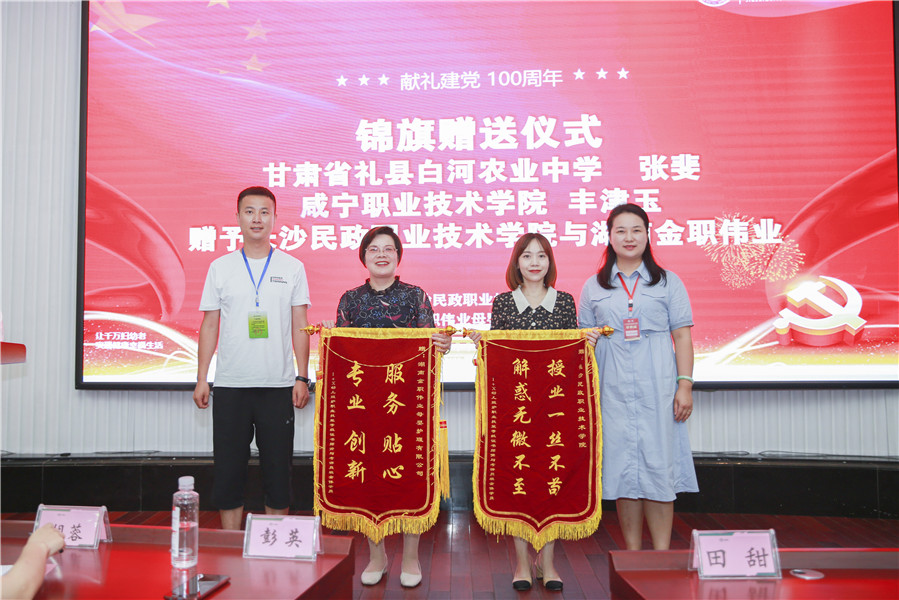 随后,甘肃省礼县白河农业中学张斐老师、咸宁职业技术学院丰津玉老师,代表全体学员向长沙民政职业技术学院和金职伟业赠予锦旗,以表深厚谢意。锦旗不仅是一份荣誉,更是一种新的使命,这将激励着金职伟业继续履行培训评价组织的使命,更加坚守服务初心。