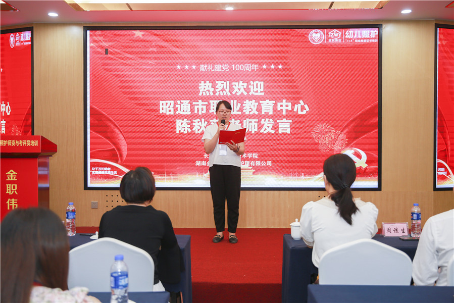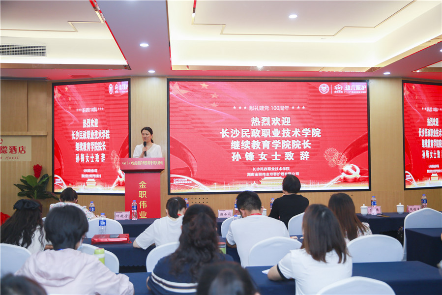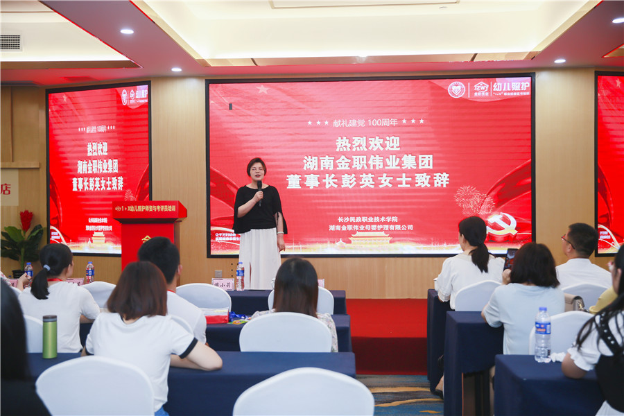 随后,长沙民政职业技术学院继续教育学院院长孙锋、湖南金职伟业董事长彭英发表致辞。孙锋院长对此次培训的圆满结束表示祝贺,“相信各位学员老师已经完全了解和熟悉1+X证书制度,掌握了幼儿照护证书的标准以及核心技能。”同时,她希望在座的专家老师在回校后,能够将所学的专业知识、技能充分运用于课堂教学和人才培养当中。彭英董事长分享道,“恭喜各位老师,又获得了两张沉甸甸的证书,这不仅是责任,更是使命。”借这美好的时刻,彭英董事长对这六天的学习培训着重分享了自己的六字感悟:感恩、创新、期待。