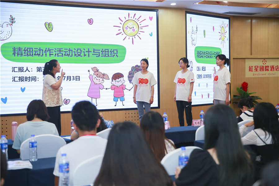 特别的是,为积极贯彻《国家职业教育改革实施方案》精神,落实教育部有关“学历证书+若干职业技能等级证书”制度试点的工作部署,持续深化三教改革,1+X幼儿照护职业技能等级证书2021年第七期师资及考评员培训班特别举办了一场教师教学能力竞赛。全体学员分为8组,以团体竞赛的形式,各参赛小组充分利用13分钟的讲解和展示时间,借助PPT、视频、动画、自主研发软件等方式展开了异彩纷呈的教学。老师们精心备课,教学设计新颖,课堂过程精彩,教态富有感染力,把各自的教学特色展示得淋漓尽致,彰显了青年教师的专业水平与个人魅力。