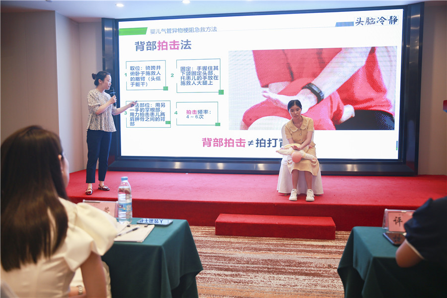 气管异物是导致幼儿意外死亡的常见原因,多发生在1-5岁的儿童,其发病骤然,病变迅速,危险性大,怎样快速又准确地对幼儿进行急救,挽救其生命,是每位幼儿教师义不容辞的责任。鄂尔多斯职业学院郝欣老师团队,以《气管异物及急救》为主题,分步骤、有条理、举实例,详细生动地讲解了气管异物急救的处理方法,并荣获本次教师教学能力竞赛一等奖。接着,长沙民政职业技术学院教学咨询与指导团队专家、湖南省教育考试院艺术类考试评委库专家胡蓉作为评审专家,在点评时分享了“无学生授课”的三条解决路径:一,教师可以进行新知讲解;二,可以进行操作示范或演示;三,可以对学生作品或作业进行评价小结。