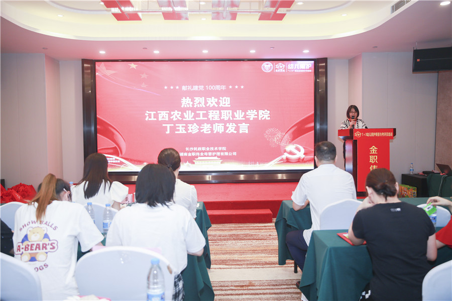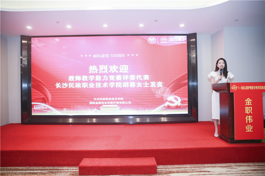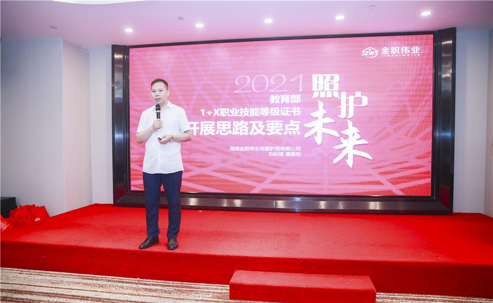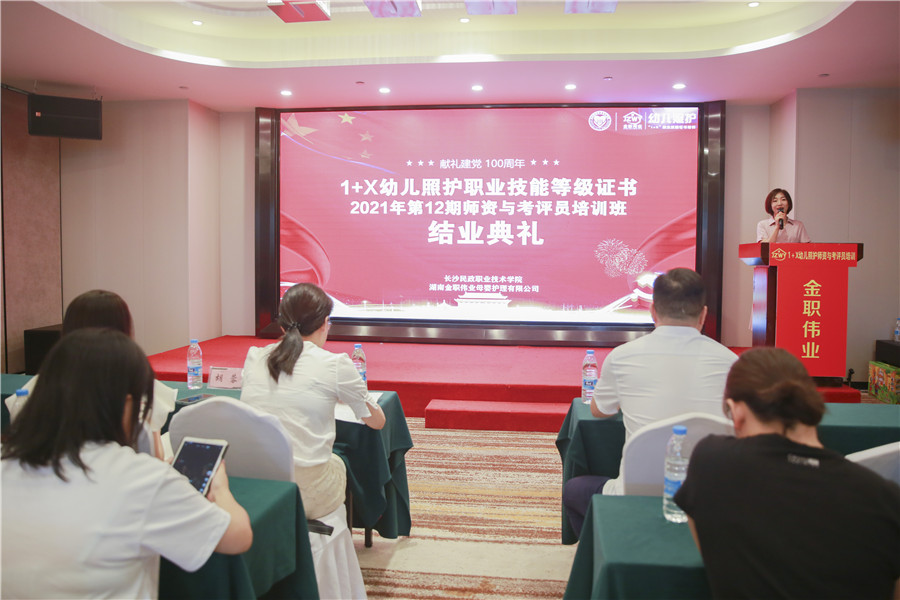 比赛结束后,1+X幼儿照护职业技能等级证书2021年度第十二期师资及考评员培训结业典礼正式拉开帷幕。长沙民政职业技术学院继续教育学院院长孙锋、金职伟业总经理潘建明出席并发言。“希望大家回到各自的工作岗位后,能互通有无,相互交流分享课证融合工作中好的经验和做法,取长补短,真正把幼儿照护的各项核心技能点融入到相关专业课的教学中,不断培养适合职业岗位需求的学生。”长沙民政职业技术学院继续教育学院院长孙锋说道。典礼上,金职伟业总经理潘建明对未来做好1+X证书制度试点工作,提出“积极参加社会实践”“申报考核站点”“做好课证融通”等12点战略方向,潘建明希望各院校能不断深化复合型技术技能人才培养模式,全力提升教育质量,为幼教事业献出自己的力量。