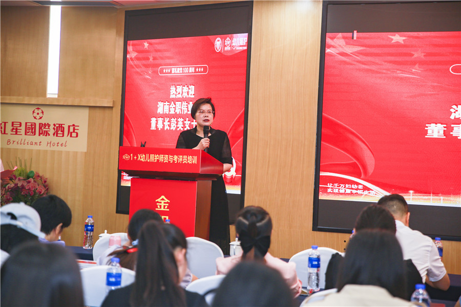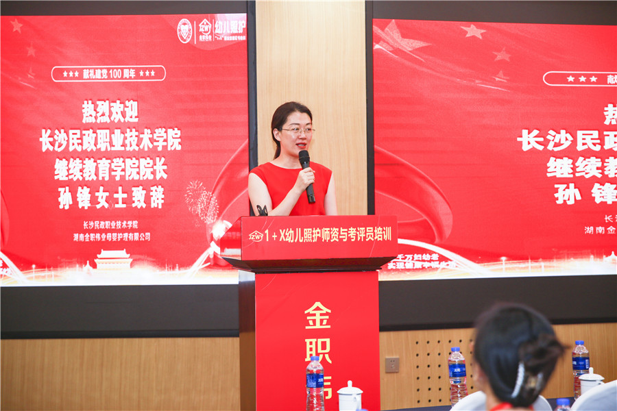 开班典礼上,长沙民政职业技术学院继续教育学院院长孙锋、金职伟业董事长彭英率先发表致辞。孙锋院长提到,国家高度重视幼儿照护等社会服务领域的人才培养,推动幼儿照护领域1+X证书制度落地,在教育、人才、产业方面,发布了一系列配套政策,作为职业院校应抓住机遇,加快推进人才培养模式的改革;一线教师应该深入研究幼儿照护职业技能等级标准,在课堂教学、课程标准制定、教材研发等方面融入标准,让学生能牢固掌握此项技能,为将来适应职业岗位需求做好准备。彭英董事长从国家政策、1+X证书工作成果、未来发展等多方面进行了系统的讲述,其中重点提及,作为1+X证书制度试点的第三批职业教育培训评价组织,金职伟业将不遗余力地推动1+X幼儿照护职业技能等级证书制度落地,推动X证书成为行业用人准入的重要依据,同时充分发挥幼儿照护职业技能等级证书对学校、企业、行业、社会的作用,多措并举构筑妇幼人才高地。