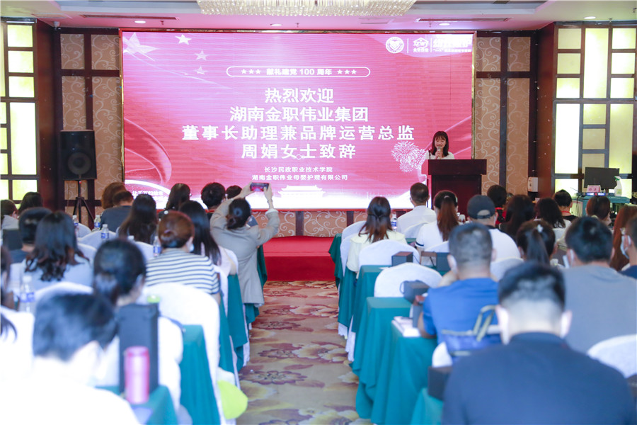 典礼伊始,金职伟业董事长助理兼品牌运营总监周娟进行开场致辞。她在讲话中提到,金职伟业作为一家年轻但有力量的企业,拥有一支专业、高效的团队,在之后还需要不断地沉淀、创新。今后,金职伟业将借助1+X平台、利用这个绝佳契机,不留余力地完善和创新幼儿照护、产后恢复领域的标准、课程、服务、教材体系,协助各大院校逐步推进1+X证书制度试点工作,多措并举促进“书证融通”,全面深化教师、教材、教法“三教”改革。