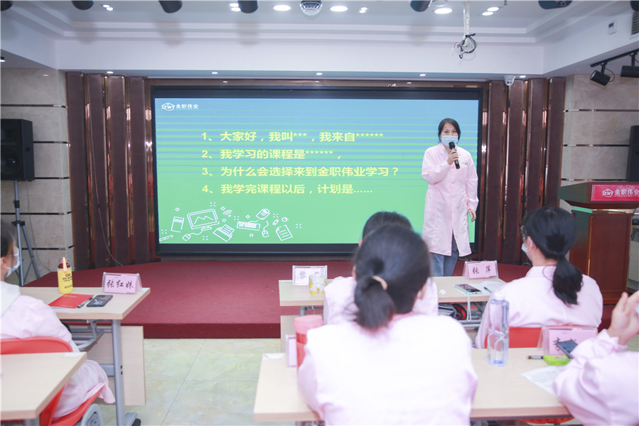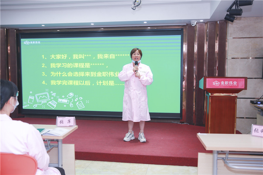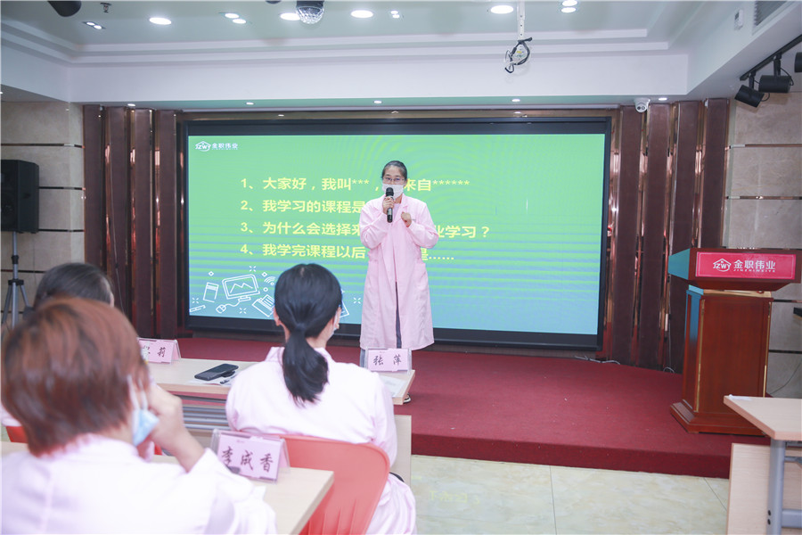 接下来,学员们纷纷上台分享自己的学习初衷。来自郴州的罗寒英姐姐率先发言,“感谢国家有这么好的政策能让我来到金职伟业学习,长沙的学习环境不一样,同学也不一样~我今年49岁,是一位妈妈的同时也是一位外婆,现在年轻人的思想和我们不同,我觉得我们也要跟着年轻人一起学习、进步,活到老学到老!”