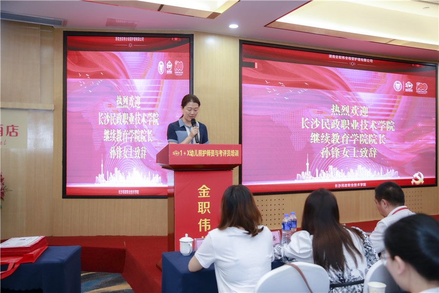 教师教学能力竞赛结束后,1+X幼儿照护职业技能等级证书2021年度第十期师资及考评员培训结业典礼正式开启。结业典礼上,长沙民政职业技术学院继续教育学院院长孙锋,金职伟业董事长彭英、总经理潘建明出席并讲话。长沙民政职业技术学院继续教育学院院长孙锋强调,在回校后,希望各位老师能够将所学的专业知识、技能充分运用于课堂教学和人才培养当中。“恭喜各位老师,又获得了两张沉甸甸的证书,这不仅是责任,更是使命。”借这美好的时刻,彭英董事长对这六天的学习培训着重分享了自己的六字感悟:感恩、创新、期待。金职伟业总经理潘建明对于1+X职业技能等级证书工作开展思路及要点进行了分享,他提出打造行业影响力,要从“先进性”“专业性”“育人性”“教学性”“规范性”“认可性”六大方面出发,赋能三教改革从而打造优秀职业教育培训评价组织。
