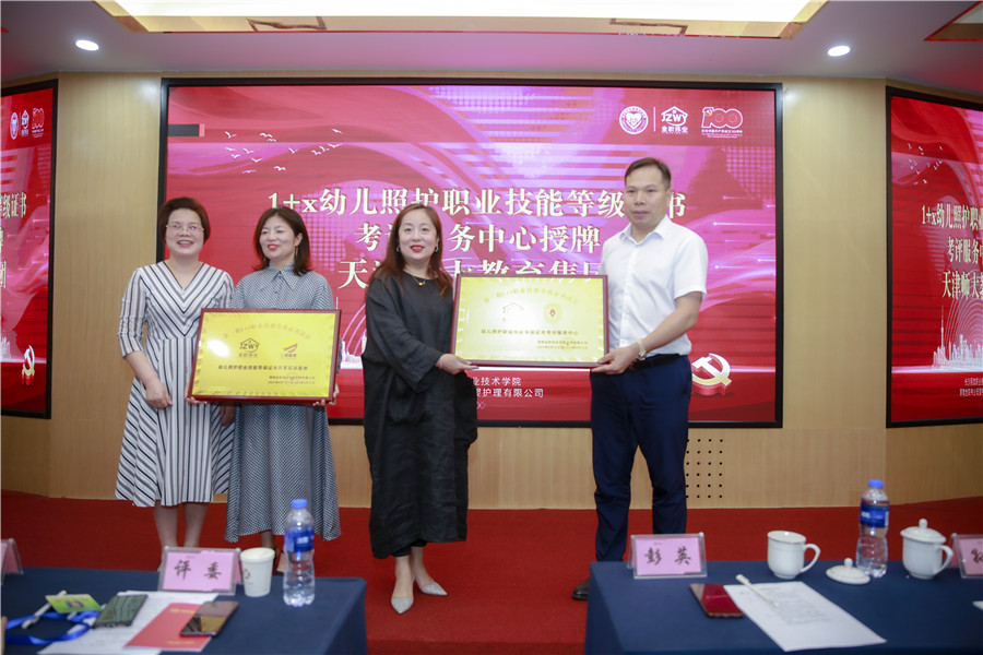 值得一提的是,典礼现场,金职伟业分别为天津师大教育集团、天津三育教育管理有限公司颁发“1+X幼儿照护职业技能等级证书考评服务中心”“1+X幼儿照护职业技能等级证书共享实训基地”牌匾。同时,凤冈县中等职业学校陈文磊老师、杨正祥老师为长沙民政职业技术学院、湖南金职伟业母婴护理有限公司赠予锦旗,以此表达学员们的深厚谢意。