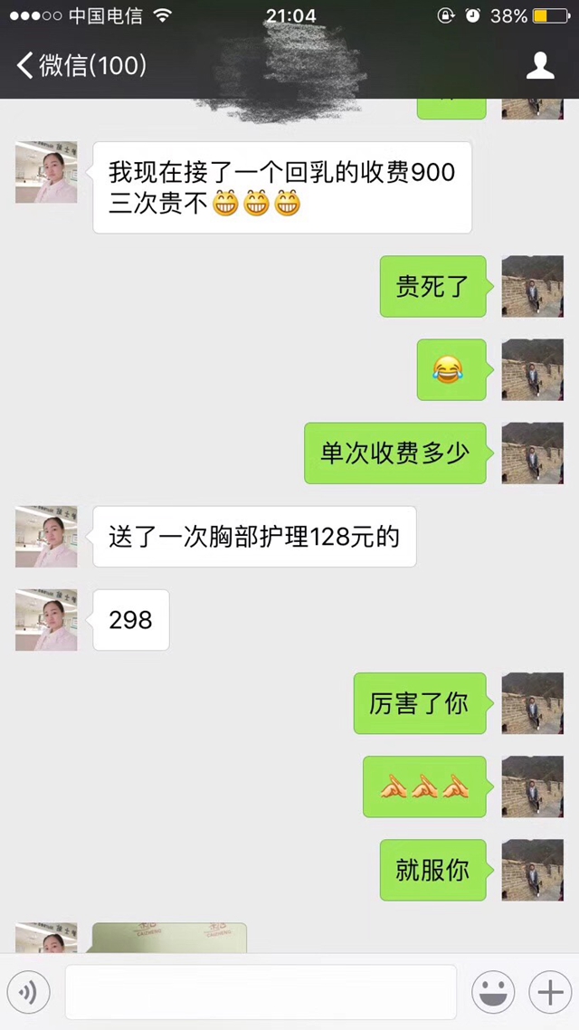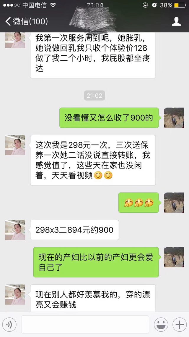 经过多方对比后,她选择了金职伟业进行催乳师培训,张姐姐大方爽朗的性格获得了学员和老师的青睐。毕业后张姐姐开始开拓市场,通过朋友圈的日常知识分享,以及发放名片的方式,张姐姐成功接到了第一单900元3次催乳服务,并赠送了一次胸部护理服务,一开始客户其实也是对张姐姐的技术有所质疑的,张姐姐自己说:“我第一次服务非常周到的,她胀乳,我就给她做回乳,硬生生做了2个小时,还只收了体验价128元,经过第一次的服务后,之后就马上买了三次服务,二话没说当场转账。”