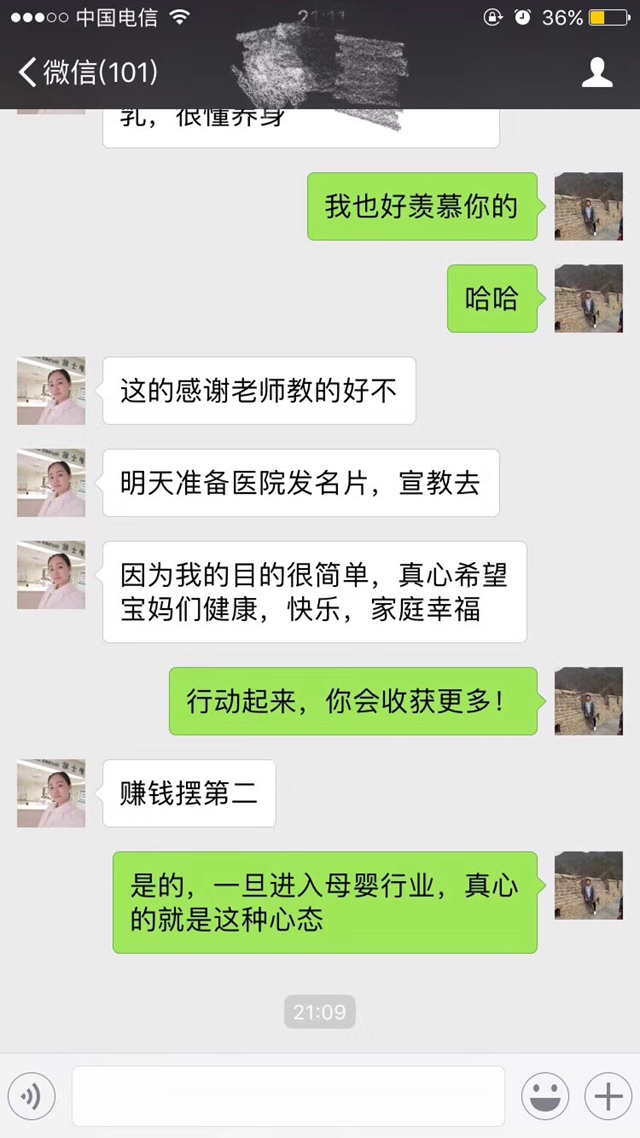胡老师也说,其实很多学员技术很好,但是放不开,不懂营销,连名片都不愿意发。其实催乳师不仅仅是赚钱,还能把科学的母乳喂养方式教给各位宝妈们,正如张姐姐所说:“我的目的很简单,真心希望宝妈们健康,快乐,家庭幸福。”