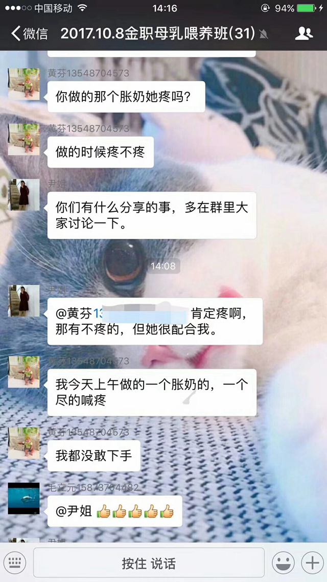 在学习上尹姐姐是非常认真的,经常问老师们关于手法的问题,并且尹姐姐能说会道,活泼开朗的性格不仅是受到了学员和老师的好评,更受到了客户的好评,去医院实习,产妇对尹姐姐非常满意,还互相留了微信成了朋友。