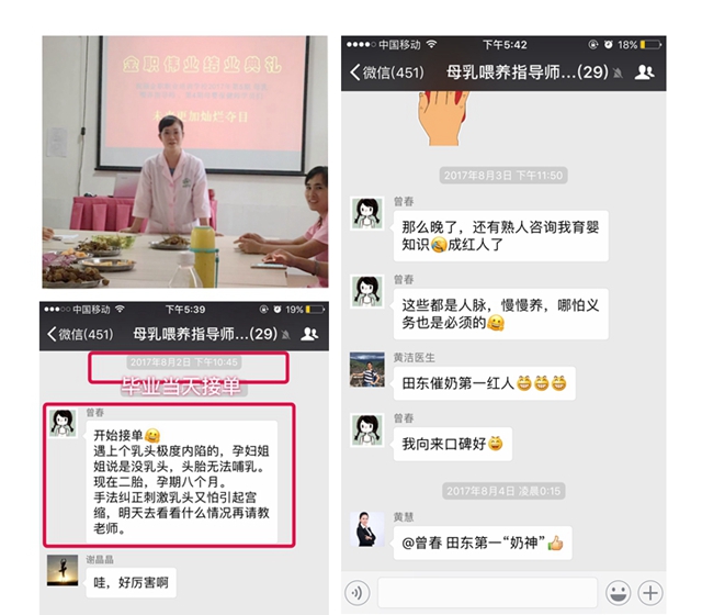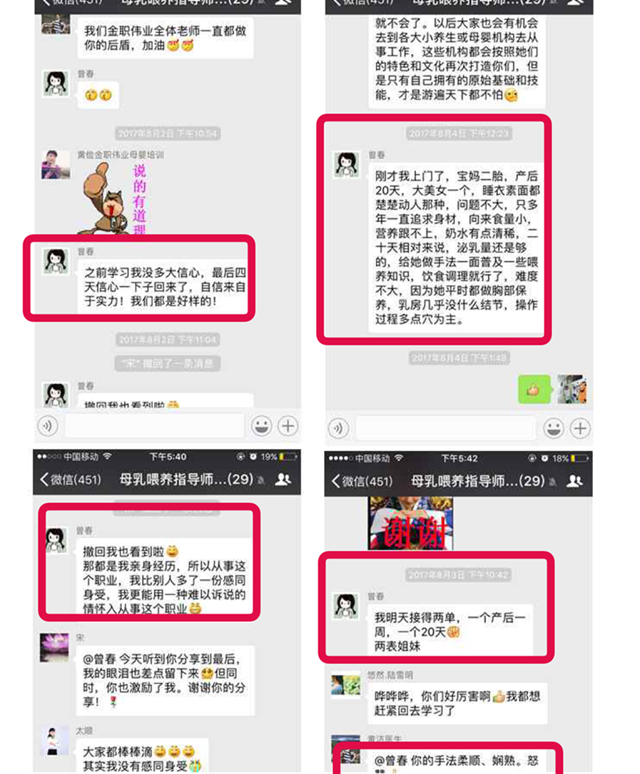 通过在南宁金职伟业的母乳喂养指导课程的学习,曾春掌握了催乳相关的专业理论知识,并且在实操课期间,在多名宝妈身上操作,毕业前已经熟练掌握了解决宝妈产后开奶、产后催乳、产后通乳、疏通乳腺管,增加乳汁分泌和产后回奶等技能手法,在结业典礼上,曾春流下了感动的泪水,她说:“太感谢南宁金职伟业的老师了,我心里的所有疑问都得到了答案,也学到了这么好技能手法,我会去帮助更多有需要的姐妹。”